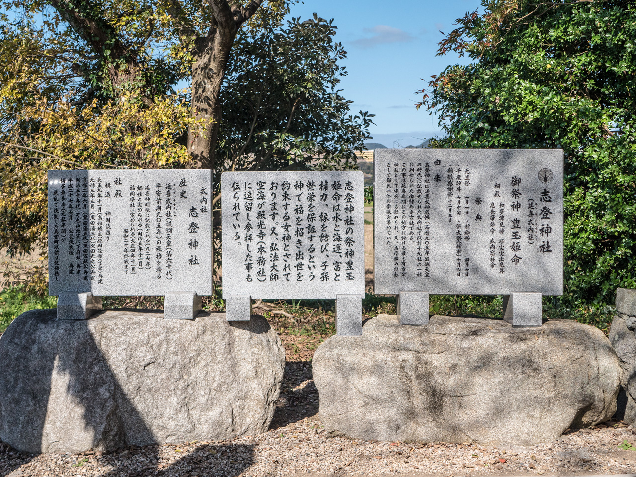 式内社志登神社の歴史、社殿、いわれ、祭典などを記した碑文です。二之鳥居前の左手にあります。